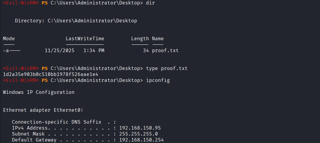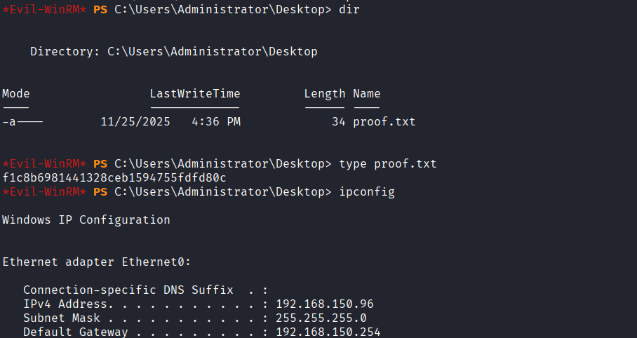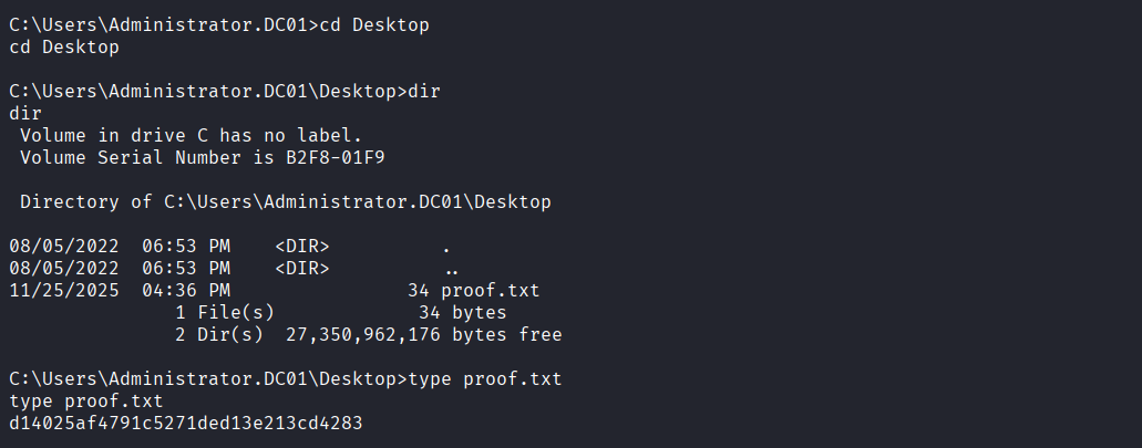 Discovered proof.txt file and obtained flag from Administrator.DC01 account’s Desktop