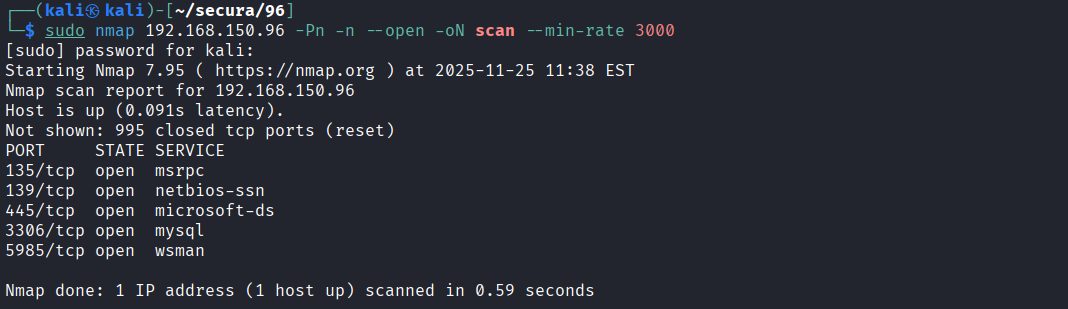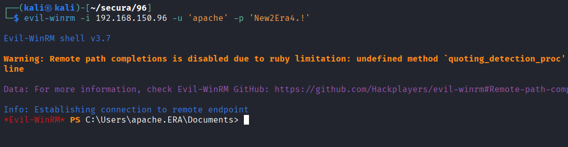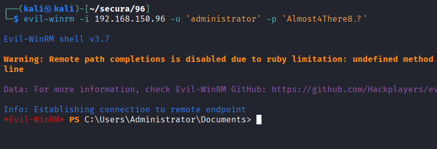 Successfully accessed to 192.168.150.96 via WinRM using administrator’s credentials