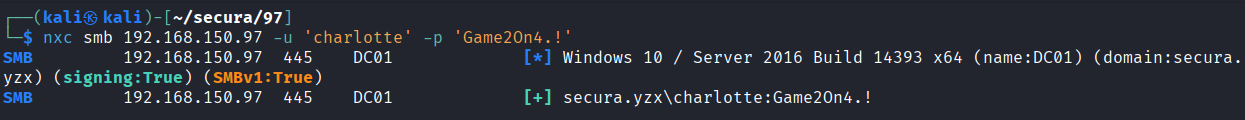 Confirmed successful SMB authentication to 192.168.150.96 using previously obtained charlotte account
