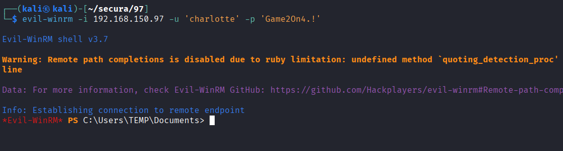 Remote WinRM access to 192.168.150.97 using charlotte account